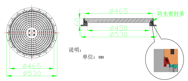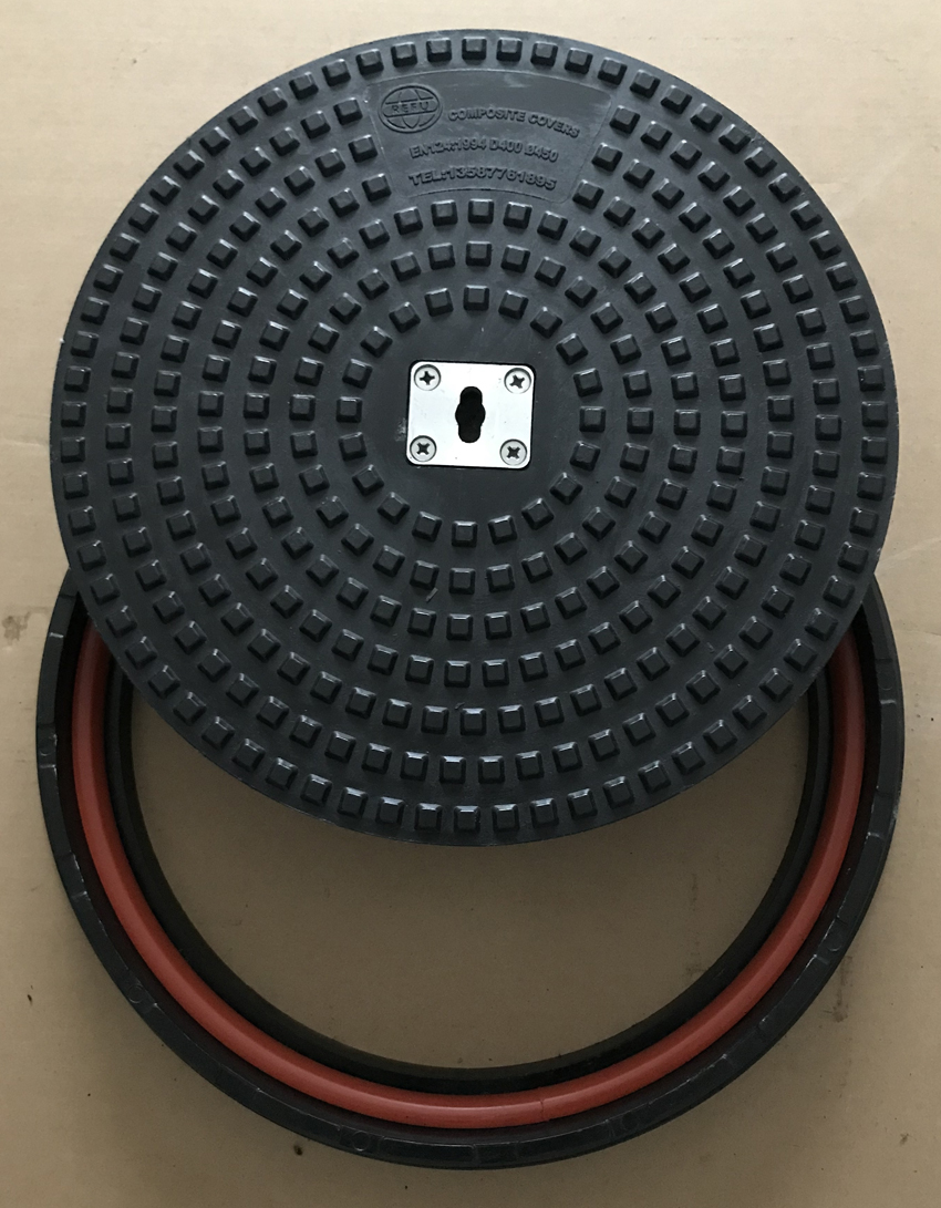 产品结构:井盖、井座、可拆卸密封装置组成产品材料组成:井盖、井座有 SMC 复合材料 组成,密封条是有耐酸、耐碱的丁晴橡胶组成